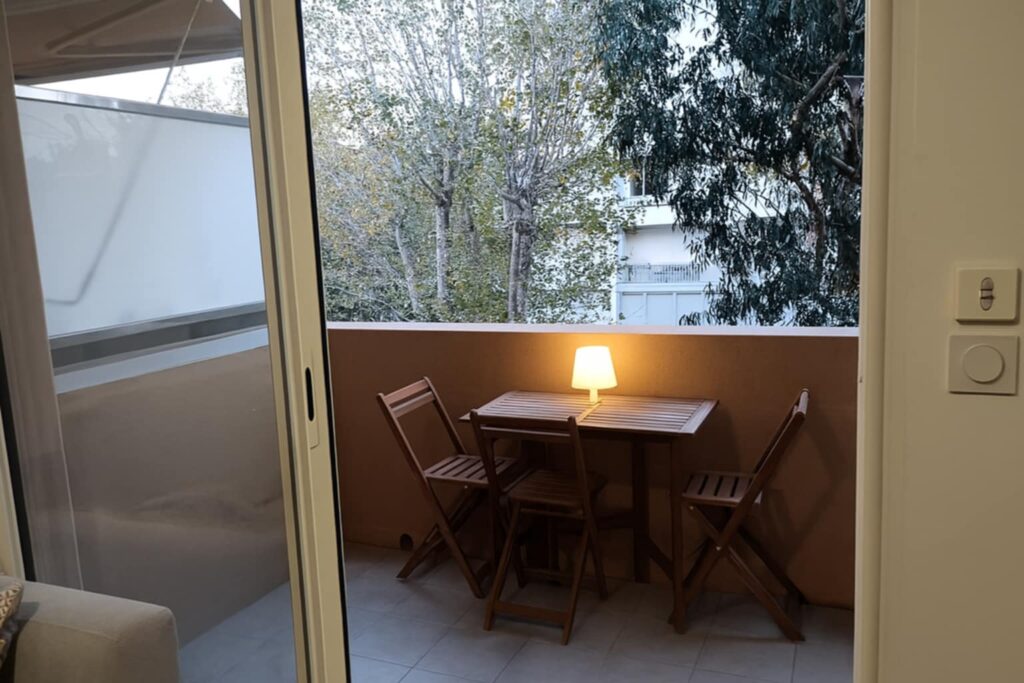 une cuisine équipée ouverte sur la salon, un WC séparé, un balcon avec un store et un salon de jardin pour 4 personnes.