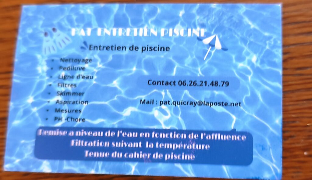 Dans le cadre de mes activités de services à la personne et de gestion immobilière, j’ai le plaisir d’annoncer mon partenariat avec Patrick, professionnel spécialisé dans l’entretien, le suivi technique et la maintenance des piscines pour les syndics de copropriété.